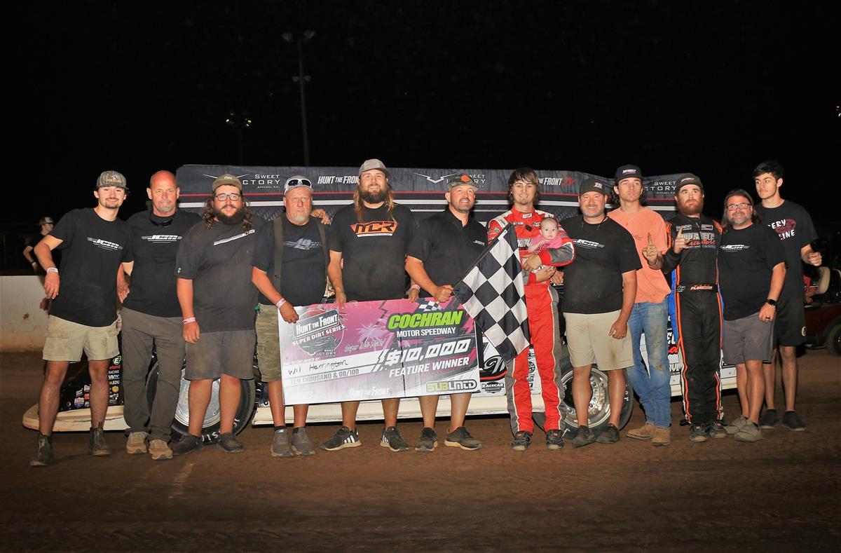 Wil Herrington enjoyed a maiden trip to the Winner’s Circle with the first-year Hunt the Front Super Dirt Series on Saturday evening at Georgia’s Cochran Motor Speedway. The triumph was worth $10,000 aboard his JCM Motorsports No. 19m Torco Advanced Lubricants / Yellow Hammer Design & Construction / XR1 Rocket Chassis / Durham Racing Engine Super Late Model.